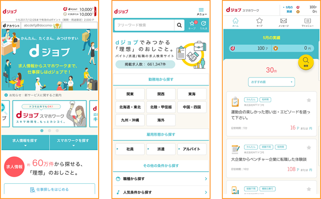 「dジョブ」は、アルバイト・派遣社員・正社員の「求人情報」や、クラウドソーシングやウェブアンケートといった、スキマ時間を有効活用して稼ぐ「スマホワーク」の仕事情報を提供するサービス。