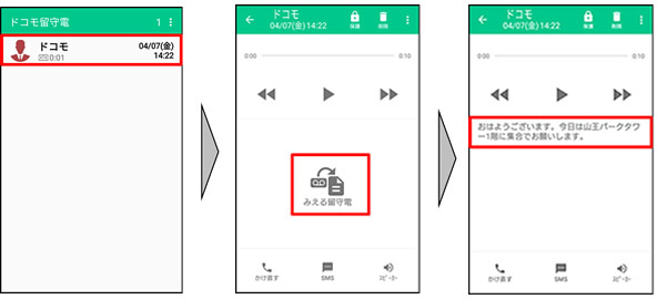 「みえる留守電」は、「留守番電話サービス」の伝言メッセージを自動でスマホにダウンロードし、好きな順番で再生できるアプリ「ドコモ留守電アプリ」に追加する新機能で、保存された伝言メッセージを文字に変換してスマホの画面に表示する。再生ボタンを押下すれば、伝言メッセージを音声で確認することも可能。「留守番電話サービス」の月額利用料は税別300円。