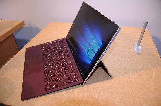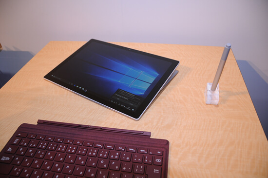 「Surface Pro史上最軽量」(パノス・パナイ氏)というように、CPUにCore m3を搭載したモデルで約768g(1.69ポンド)の軽さを実現した。Core m3とCore i5搭載モデルはファンレス構造となり、静音性と、最大約13.5時間の長時間駆動を実現した。「Pro 4」では9時間だったので、バッテリ駆動時間は飛躍的に延びた。なお、Core i7搭載モデルは、作業中やビデオ再生中も静かなハイブリッド冷却システムを内蔵する。