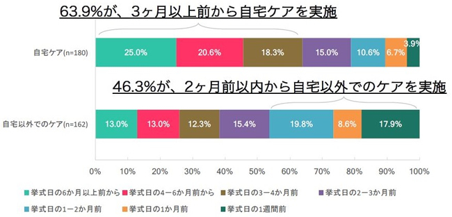 自宅でのケアは、63.9%が挙式日の3か月以上前から開始していたのに対し、自宅以外のケアは、直前の「1週間前」を含め、46.3%が挙式日の2か月以内に開始したと回答した。