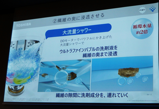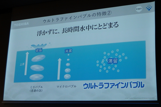 ウルトラファインバブルは直径1μm未満のナノサイズの微細な泡で、水中で浮力の影響を受けずに泡の状態で長く滞留する特徴がある。このナノサイズのバブルが、洗剤の洗浄成分である界面活性剤の「運び役」となり、衣類の繊維の奥深くまで入り込むことで洗浄力が高まる仕組みだ。