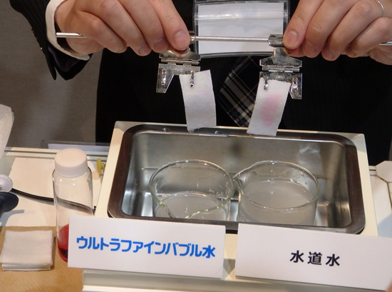 デモでは、ウルトラファインバブル水と水道水に液体洗剤を入れて、水あめや皮脂汚れの取れ具合を比較した。いずれも、ウルトラファインバブル水の方が汚れ落ちの高いことが確認できた。