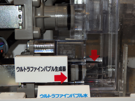 通常はまとまっている洗浄成分の界面活性剤は、ウルトラファインバブルによってばらばらになり、微細なバブルの周囲に吸着しながら衣類の繊維に入って汚れを落とす。また、普段からウルトラファインバブルで洗濯し続けることで、皮脂汚れの蓄積と黄ばみが抑えられるので、水道水で洗濯した場合と比較して、1年後の衣類の白さが違うとする。