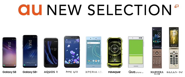 スマートフォンは、サムスン電子製の「Galaxy S8 SCV36」「Galaxy S8+ SCV35」、シャープ製の「AQUOS R SHV39」、HTC製の「HTC U11 HTV33」、ソニーモバイルコミュニケーションズ製の「Xperia XZs SOV35」、京セラ製の「TORQUE G03 KYV41」「Qua phone QX」の7機種。「Galaxy S8/S8+」は6月8日に、「HTC U11」と「TORQUE」は6月下旬、「AQUOS R」は7月上旬、「Qua phone」は7月中旬に発売する予定。