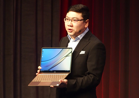 「CES ASIA」で同社初のクラムシェルPCを発表するファーウェイの万飈COO