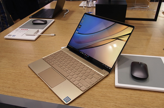 13インチの薄型で軽量の「MateBook X」は、薄さ12.5mmでCNC加工を施したアルミ筐体が特徴。重さは1.05kgと軽い。ベゼルが4.4mmと細いため画面占有率が88%と高く13インチ画面を備えながらボディサイズはA4より小さい。画面解像度は2160×1440ドットと高精細だ。CPUには第7世代のインテルCore iのUシリーズを採用しながら、連続12時間駆動を実現する。冷却ファンを省き独自の冷却システムを装備した。電源ボタンに指紋認証機能を持たせ、ワンプッシュで電源オンとログインができる工夫も施した。防滴キーボードも採用し多少水をこぼしても大丈夫だ。