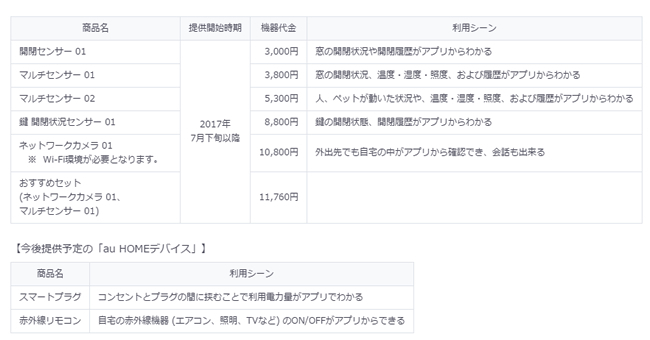利用にあたっては、「au WALLET Market(auショップ)」で販売する「au HOMEデバイス」の購入が必要で、機器(デバイス)の種類によって利用できる機能が変わる。機器代金は「ネットワークカメラ 01」と窓の開閉状況、温度・湿度・照度がアプリからわかる「マルチセンサー 01」をセットにした「オススメセット」の場合で1万1760円。
