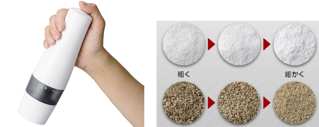 金属製のミルでは挽くことが難しい、湿り気のある海塩やピンク岩塩なども挽くことが可能。ボタンは本体上部にあり、底部の粗さ調整ツマミを左右に回して調整すると、好みの粗さに挽ける。使い終わった後に置けば、臼部分に残った食材が飛び散らない専用の台座付き。電源は単3形乾電池4本。