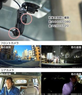 フロントカメラは1080p、リアカメラは720pの高画質で、前後同時に録画可能。記録方式は、PCの標準ソフトで再生可能なmov形式。GPSを搭載しており、走行状況に加え、撮影時の場所や速度、方角、ショックセンサの情報を、専用ソフトで位置情報とともに取り出せる。