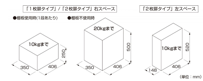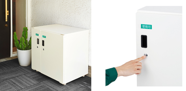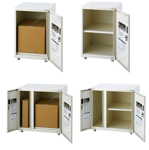 玄関前などに設置できるコンパクトサイズで、1枚扉タイプは横400×縦625×奥行450mm、2枚扉タイプは横600×縦625×奥行450mm。