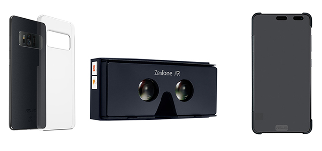 付属の組み立て式VRメガネ、クリアケースと、本体の両面を保護する別売のZenFone AR専用カバー