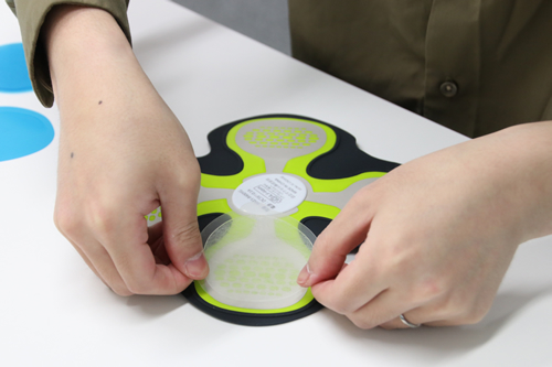 要領はスマートフォンの保護シートを貼るのと変わらない。気泡が入らないように、端からしっかりと密着させて電極部の上を覆う。これで準備はOK。あとは腹筋に貼り付けるだけだ。
