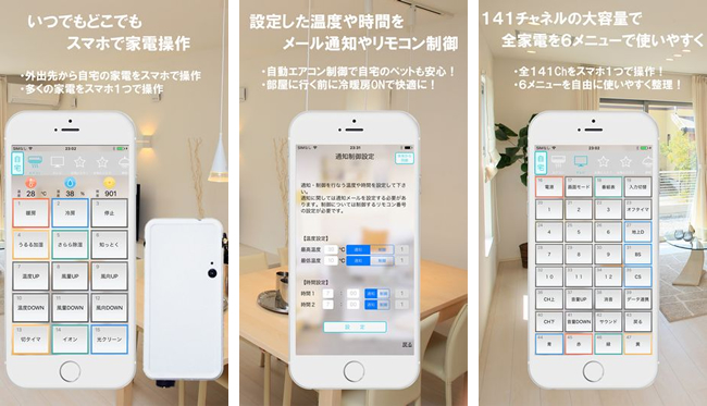 専用アプリは、6つの画面を用意。あらゆる家電の赤外線信号フォーマットに対応しているので、自宅の家電を画面上の141ボタンに割り当てられる。