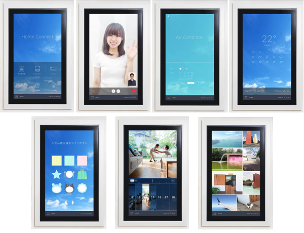 7つの機能「Home Connect(家電連携機能)」「Video Chat(チャット機能)」「Air Conditioning(換気機能)」「Weather(天気機能)」「Drawing(メモ機能)」「Life Log(ライフログ機能)」「Mirroring(ミラーリング機能)」の各イメージ