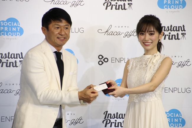 Social Print Cloudの広報担当になったモデルの泉里香さんと、特別ゲストのサッカー元日本代表でタレントの武田修宏さん