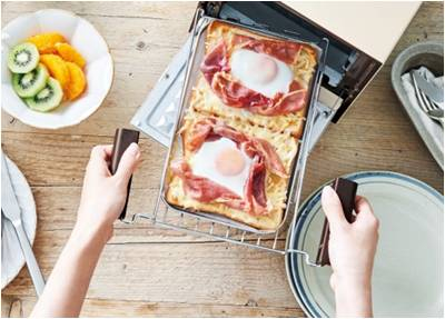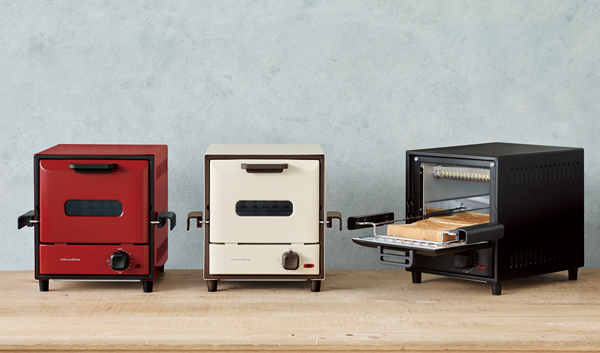庫内の熱が逃げにくい設計の小さなガラス窓やが印象的な、インテリアに溶け込むデザインで、トースト2枚を並べて焼けるにも関わらず、幅を取らないA4サイズのスペースに置けるコンパクトサイズ。カラーは、マットな質感のシックなホワイト、レッド、ブラックの3色。アレンジトーストや焼き菓子、お酒のおつまみなど、18品のレシピを掲載した専用レシピブックが付属する。