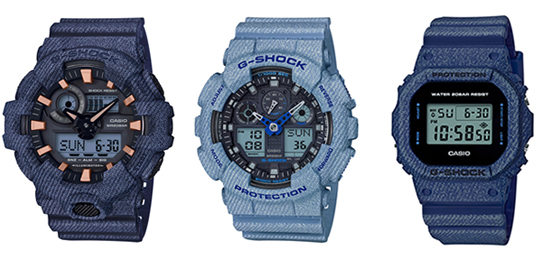 男性向けのG-SHOCK、女性向けのBABY-Gとも、カジュアルファッションの定番アイテム、デニムの風合いを、独自の加工技術でケース・バンドへ施し、デニム本来が持つタフなイメージとクールなデザインを融合した。