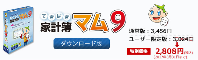 サンテクは、メールマガジン「マム☆レター」の創刊500号達成を記念し、「てきぱき家計簿マムシリーズ」のユーザー限定で、通常価格3024円の「てきぱき家計簿マム9 ユーザー限定 ダウンロード版」を税込2808円の特別価格で販売するキャンペーンを8月31日まで実施する。