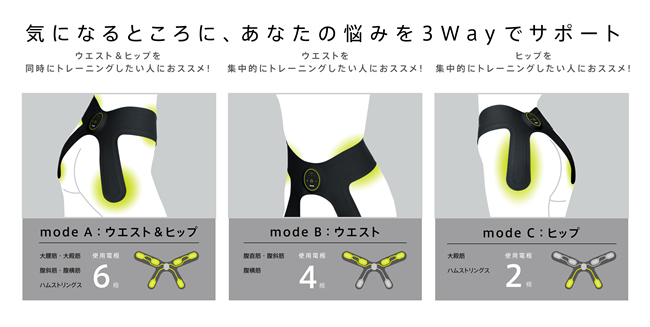 気になるウエストやヒップラインを集中的に鍛える「mode A:ウエスト&ヒップ」「mode B:ウエスト」「mode C:ヒップ」の3種類のトレーニングモードを搭載。15ステップのトレーニングパターンと、15段階の強度レベルを組み合わせ、約20分間のトレーニング中に自動で切り替えるオートトレーニングなので、操作の必要がなく、筋肉の慣れを防いで効果的なトレーニングが可能だ。
