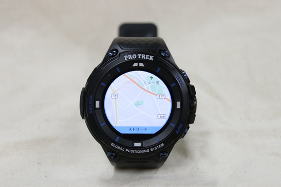 事前にダウンロードした地図をみれば、リュックサックやバッグから紙の地図やスマホを取り出す手間が省ける。土などで多少汚れた手でも、本体側面のアプリボタンを押せば地図が確認できるので、ディスプレイを汚すこともなく非常に便利だ。モノクロの時刻表示に切り替わったときのディスプレイは明るく、太陽の下でも見やすかった。