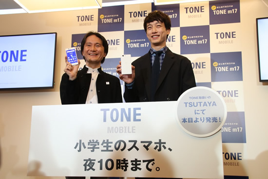 トーンモバイルの石田宏樹代表取締役社長CEO(左)と坂口さん