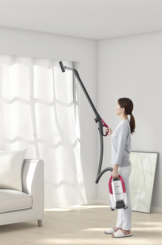 4機種共通の特徴として、手元パイプ部に軽量素材「ドライカーボン」を採用したほか、本体構造の軽量化によって、パワーブラシタイプとしては世界最軽量の総質量2.9kgを実現した。手にかかる負担を大幅に軽減したので、敷居や段差、狭い場所はもちろん、付属の「はたきノズル」を使用すれば、床だけでなくエアコンや冷蔵庫、棚の上などホコリがたまりやすい高い場所も楽に掃除できる。