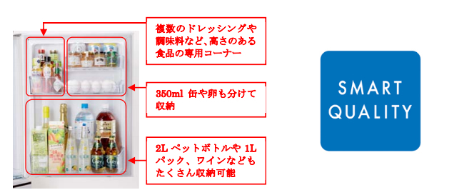 使いやすい収納と毎日の調理をサポートする機能を搭載。具体的には、冷蔵室の棚は500ml/350ml缶や、作り置きした料理を鍋ごと保存できる高さを確保し、扉にはドレッシングや調味料を取り出しやすい専用コーナーを設置。200Lクラスでは業界で初めて、氷点下でも食品を凍らせずに肉や魚を生のまま長く保存できる「氷点下ストッカー」を搭載する。