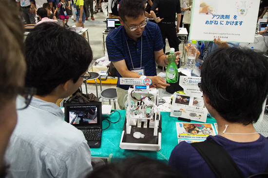 実用的なのかウケ狙いなのか判断に迷う展示も楽しい。常に人だかりが耐えなかったのは坂井義治(めだか部)さんが出展した全自動眼鏡洗浄ロボ「洗っとく子ちゃん」だ。3軸関節ロボットを使った筐体に眼鏡をセットすると、器用に眼鏡の角度を変えながら洗剤を振りかけ、水洗いし、ブロワーで乾かすというもの。細かな動きがコミカルでついつい見入ってしまう。