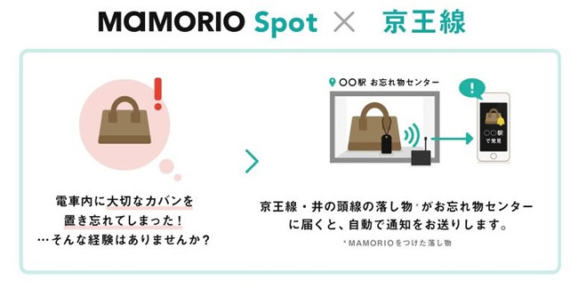 京王線・井の頭線の忘れ物取扱所(明大前駅)、京王線の新宿駅事務室(百貨店口)、京王線の新線新宿駅事務室(京王新線口)、井の頭線の渋谷駅事務室(中央口)に専用アンテナ「MAMORIO Spot」を設置。ユーザーが購入した「MAMORIO」を、バッグや財布などの所持品に貼り付け、スマートフォンに専用アプリ「MAMORIOアプリ」をインストールして登録しておくと、万が一、所持品を紛失しても、「MAMORIO Spot」設置場所に届けられると、専用アンテナが「MAMORIO」の電波を検知して自動的にスマホに通知する。