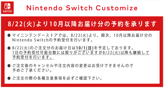 「マイニンテンドーストア」では、「Nintendo Switch Customize」として、Nintendo Switch本体の「Joy-Con」(6色)と「Joy-Conストラップ」(7色)の色を自由に組み合わせて購入できる。8月22日の注文分は10月1日に届く予定で、注文後のキャンセルやカラーの変更などは受け付けない。支払方法はクレジットカードのみ。税込価格は3万2378円。