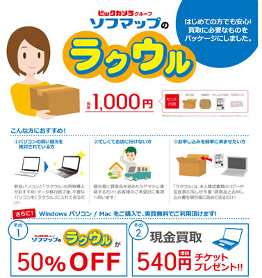 ラクウルは、ソフマップの買い取りサービスにノートPCを送るのに必要な梱包箱、緩衝材、申し込み用紙、宅配便の送り状(着払い)を一つにパッケージ化したキット。税別価格は1000円。ソフマップは、買い取った商品のデータ消去や動作チェック、クリーニングなど、最大68の工程を経て、店頭で中古商品として販売する。