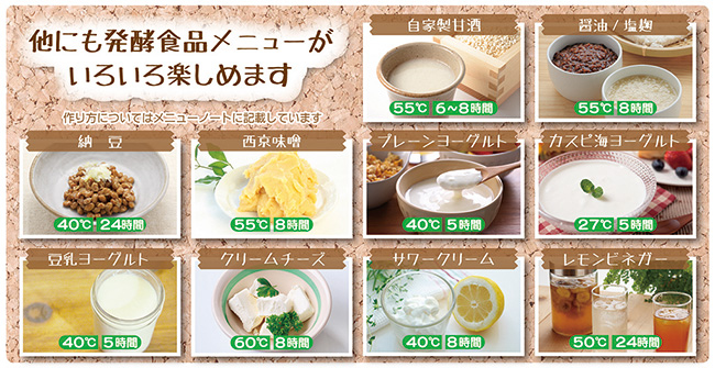 温度設定は25度~65度(1度刻み)、時間設定は1時間~48時間(1時間刻み)で細かく設定可能なので、さまざまな発酵食品づくりに対応する。付属のメニューノートには、甘酒・塩麹・醤油麹・納豆・西京味噌・プレーンヨーグルト・カスピ海ヨーグルト・豆乳ヨーグルト・クリームチーズ・サワークリーム・レモンビネガーの計11種類のレシピを掲載する。