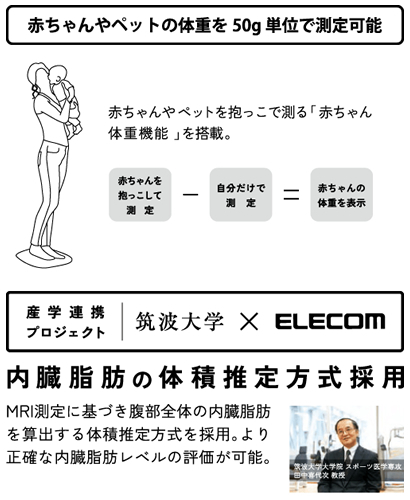 赤ちゃんやペットを抱っこした測定値と自分の体重の測定値から、自動で差分を表示する「赤ちゃん体重機能」を搭載。50g単位で赤ちゃんやペットの体重変化を精密に測ることができる。