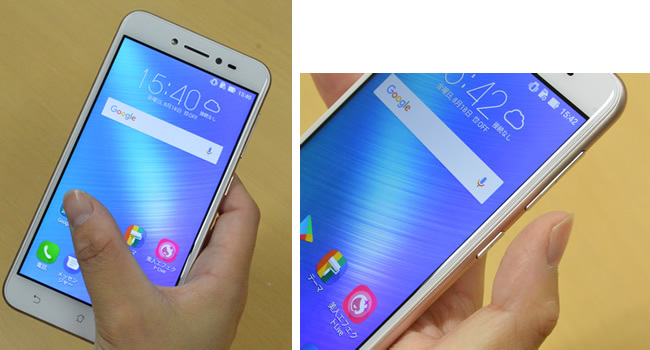 120gは、コンビニのおにぎりとほぼ同等の軽さだ。きょう体に上品なメタリックコーディングが施されているので、見た目よりだいぶ軽い印象を受ける。筆者は、いつも胸ポケットにスマホを入れて持ち歩いているが、「ZenFone Live」はつい存在を忘れるほど。現在主流のスマホはほとんどが140g前後だが、20gの差がいかに大きいかを実感した。