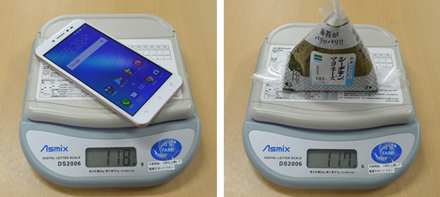 重さはコンビニのおにぎりとほぼ同等。「ZenFone Live」は公称では120gだが実測では118gだった