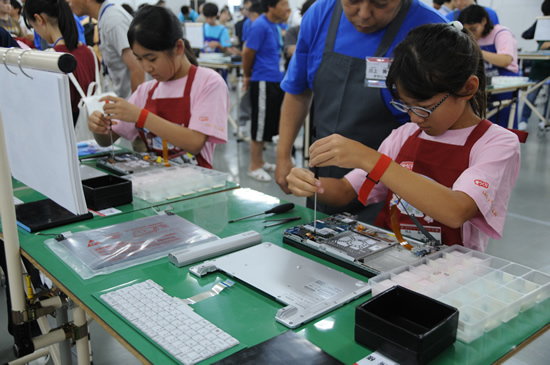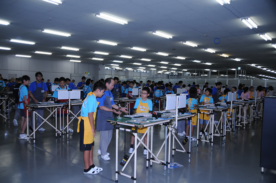 2人1組の子どもに対して、普段は神戸工場の技術メンバーなどとして働く社員1人がついて、丁寧に教える。使用する部品は、メイン基板やLCD、キーボード、テープやシートなどの材料、7種類のネジなど、合計23種類に及ぶ。