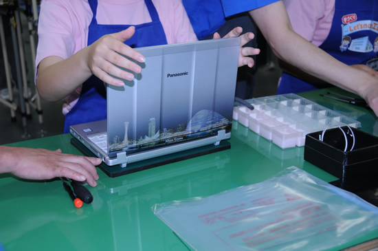 組み立てたPCは、昼食や午後の工場見学の間に、通常の出荷時と同じ検査工程が踏まれる。工場見学から戻ると自分だけのレッツノートが机に置かれており、ID登録や保証書を発行しながら緩衝材と一緒に段ボールに梱包する。最後はバスに乗って、神戸工場のスタッフたちに見送られながら、子どもたちは「レッツノート工房」を後にした。(BCN・細田 立圭志)