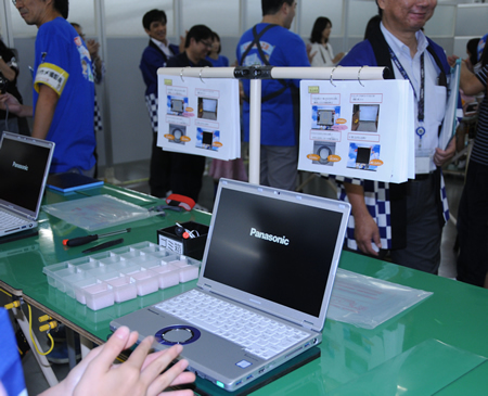 午前10時から開始した組立作業は、11時30分ごろに終了。緊張した面持ちで電源を入れてしばらくすると、黒い液晶ディスプレイの画面に白いパナソニックの文字がくっきりと表示。一斉に子どもたちの拍手や大きな歓声でわいた。キーボードの動作確認や検査も自分たちで行う。