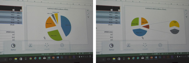 オフィス系のソフトであれば、セルやシートをすばやく移動させたり、フォントサイズを調整したりすることが可能。ツールバーで動作を切り替えることで複数の作業に対応する。グラフのフォーマットを変更するときも、これまでであれば数度のアクションが必要だったが、「CROWN」であればダイヤルをひねるだけで瞬時にいくつものパターンを表示することができる。