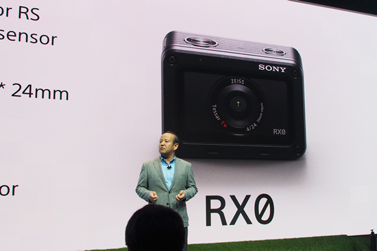 プレスイベントで新カテゴリのカメラ「RX0」を発表する、ソニーヨーロッパの粂川滋社長