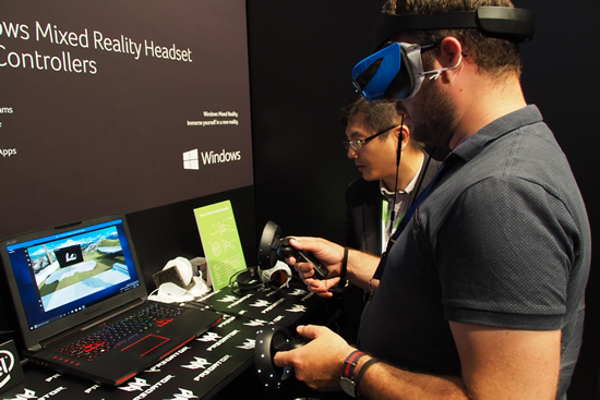 プレスイベント会場では、マイクロソフトが10月にリリースするWindows 10 Fall Creators Update(Windows 10 FCU)に対応するゴーグル「Windows Mixed Reality Headset」とマイクロソフトのVRコントローラーのデモも行った。(BCN・道越一郎)