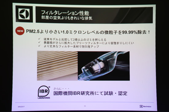 「エルゴラピード リチウム プレミアム」は、掃除と同時に排出する空気もきれいにする高性能プリーツフィルターを搭載。PM2.5よりも小さいカビの胞子など、1.0ミクロンレベルの微粒子を、99.99%除去することができる。