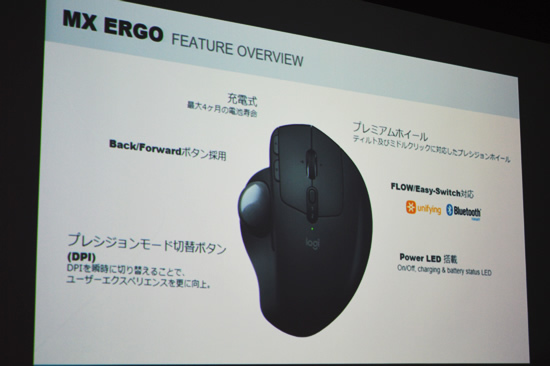 同社のトラックボールとしては2010年にリリースした「M570」以来の新製品となる「MX ERGO」は、6月に発表した「MX Master 2S」と同じく、マウスカテゴリのハイエンドを指す「MX」の型番を冠する。