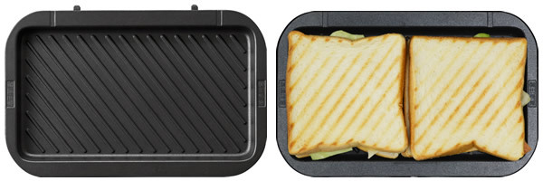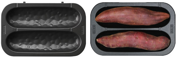 新たに開発した専用焼き芋プレートの上にサツマイモをのせると、本体上下のヒーターでじっくり包み込むように焼き、サツマイモの甘さを最大限に引き出す。サツマイモに熱が均等に伝わるよう、プレートの表面には凹凸をつけ、フッ素コーティングを施した。