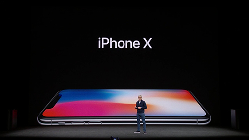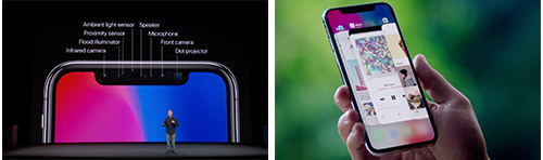 2時間弱の発表会のうち、1時間をiPhone関連に割き、その中で「スマートフォンの未来を提示する新たなモデルとした発表した「iPhone X」は、5.8インチ、解像度2436×1125、458dpi、高コントラスト比1000000:1の有機ELディスプレイ「Super Retinaディスプレイ」を搭載し、画面いっぱいにディスプレイが広がるデザインと、新しい700万画素の「TrueDepthカメラ」を活用した3D顔認証機能「Face ID」を採用。画面ロックの解除やApple Payによる支払いが顔認識で利用できる。これまで画面下部にあったホームボタンはなくなり、あわせてUIも再設計。下側からスワイプするだけでホーム画面に戻れる。