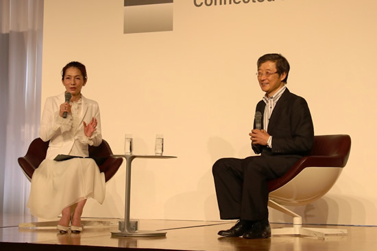 対談形式でアライアンスの意義を説明するMCの渡辺真理さん(左)と
