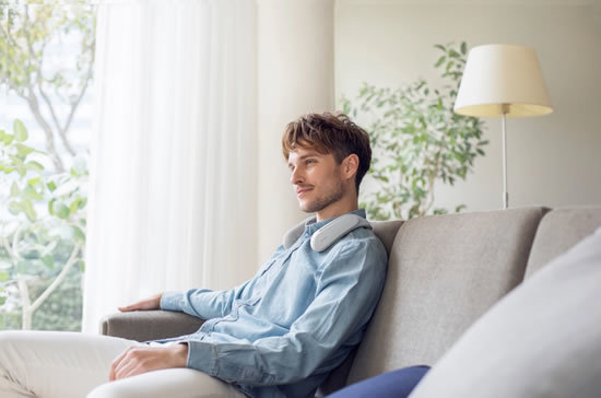 背中から肩、鎖骨のラインに沿ったアーチ形状とインナークッションで、長時間の使用やラフな姿勢でも安定して快適に装着できるようにした。肌に触れる内側には、汚れにくい加工を施したファブリック素材を採用。カラーは、リビングになじむライトグレー。