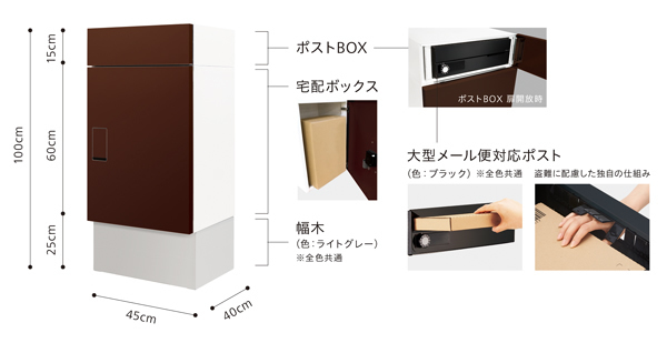 2017年2月に大和ハウス工業、ナスタ、日本郵便で共同開発した宅配ボックス「Qual-Dbox(クォール・ディーボックス)」で好評だった、独自の仕組みによる大型のメール便や不在票を安全に受け取れる「メール便対応ポスト」と、荷物の受け取り・荷物の発送・日本郵便の書留郵便の受け取りが可能な「宅配ボックス」を1台に組み合わせた据置型。1台で「メール便対応ポスト」と「宅配ボックス」の機能をあわせもち、電源を使用しないため電気工事が必要なく、既存戸建住宅でも簡単に設置できる。