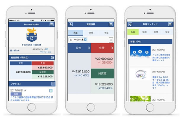 資産形成支援専用アプリ「Fortune Pocket」は、見る、分析する、学ぶといった資産形成における基本要素を提供することで、資産形成期から相続期までのライフステージに応じたシームレスな資産管理・資産形成をサポートする。