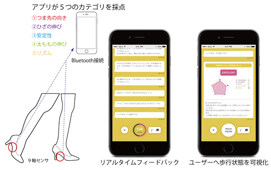 歩行指導アプリでは、歩き方をぐらつきやリズムなど5項目で点数化し、その各項目でユーザーの歩き方を解析、歩き方のコツや意識すべきポイントなどをリアルタイムに音声で指導する。毎日3分程度のアプリ使用によって、歩き方を美しく改善して、自信を持ってハイヒールを履きこなせるようになる。